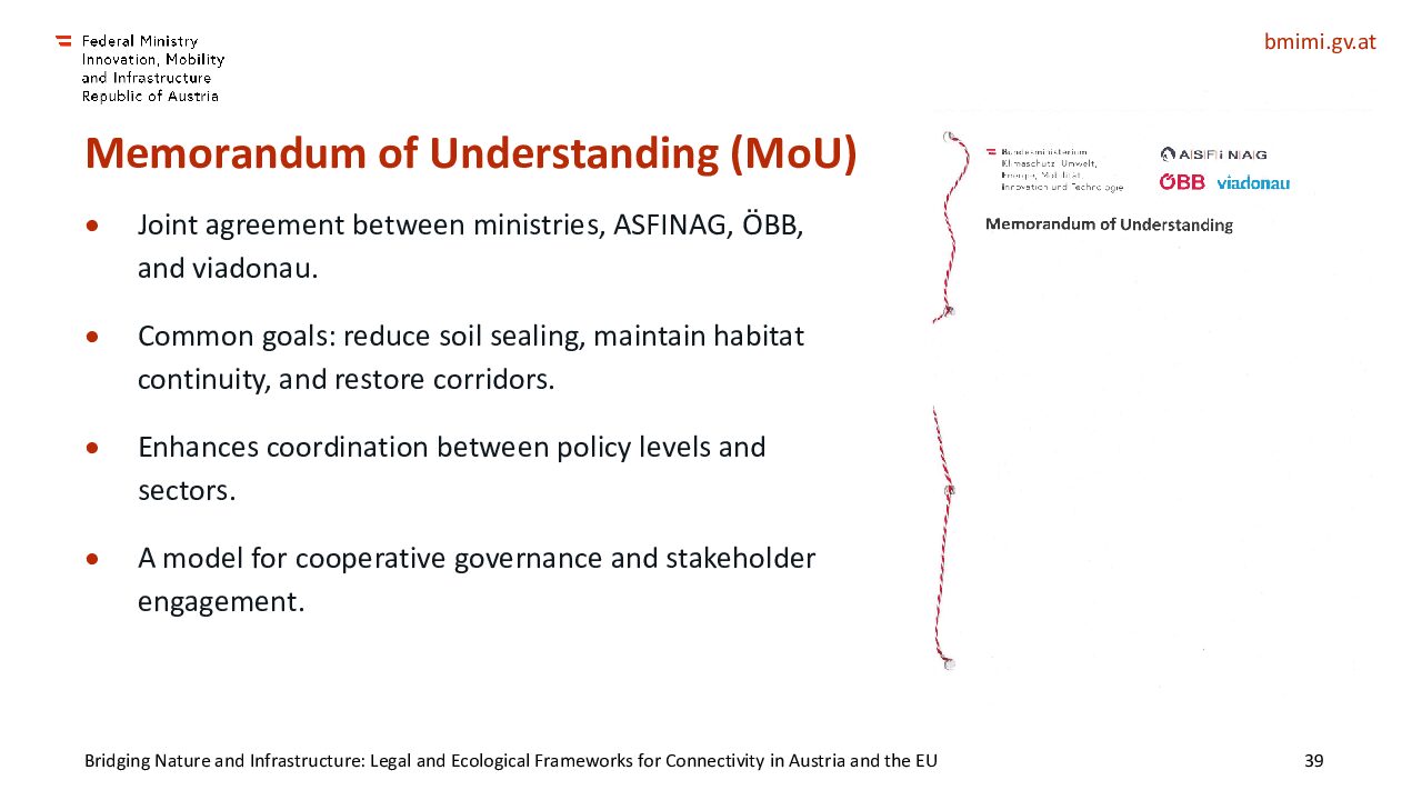 The government is also counting on working with major infrastructure managers to create uninterrupted green corridors and to increase biodiversity on the widespread areas owned by infrastructure operators. In 2024, with this aim in mind, the the Ministry for Energy, Environment, Mobility, Innovation & Technology signed a Memorandum of Understanding (MoU) with the three companies responsible for the countryâs motorways (ASFiNAG), railways (ĂBB Infrastruktur AG), and waterways (Viadonau). An initiative that makes sense â such joint initiatives can improve overall landscape permeability â but which also isnât without its challenges.