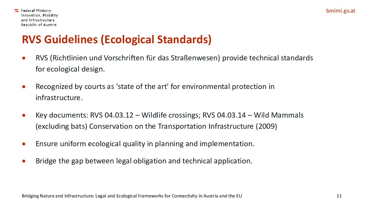Also at federal level, the RVS Guidelines (ecological planning standards) are designed to help infrastructure engineers and planners translate legal requirements into technical solutions such as green bridges and amphibian tunnels. âHarmonisation under RVS standards aligns both the railway and motorway sectors ecologically,â says Ms Sattlberger.