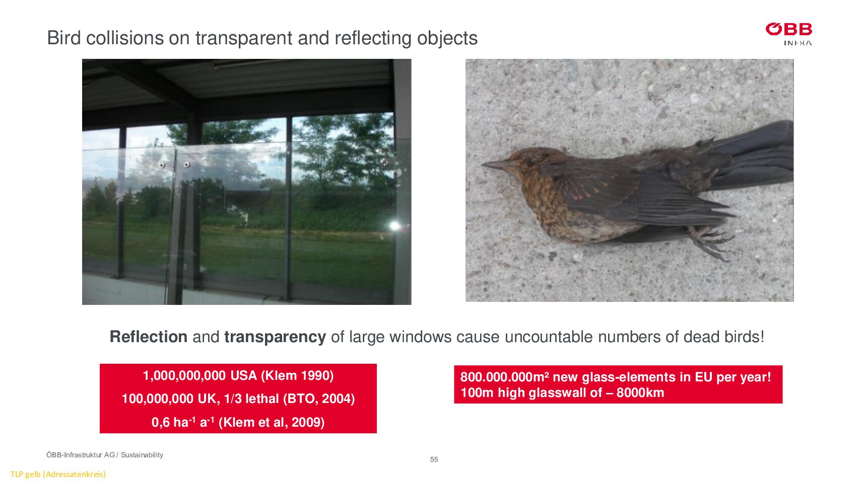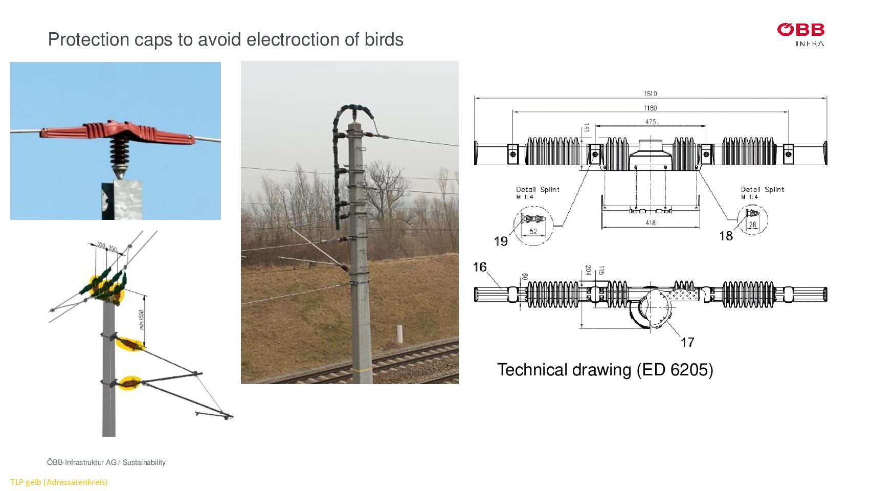 ĂBB Infrastruktur AG is also committed to protecting birds from the risks of collisions and electrocution along its rail tracks. Measures implemented include equipping catenary posts with isolation caps and attaching reflective (day and night) firefly tags on overhead wires. All these devices deter birds from perching. Another action, designed to stop birds flying into glass on the companyâs buildings, has been to integrate foils into the companyâs internal standards for windows and doors to make the glass more visible. âA development that helps prevent people from walking into the glass too!â adds Mr Schuh.