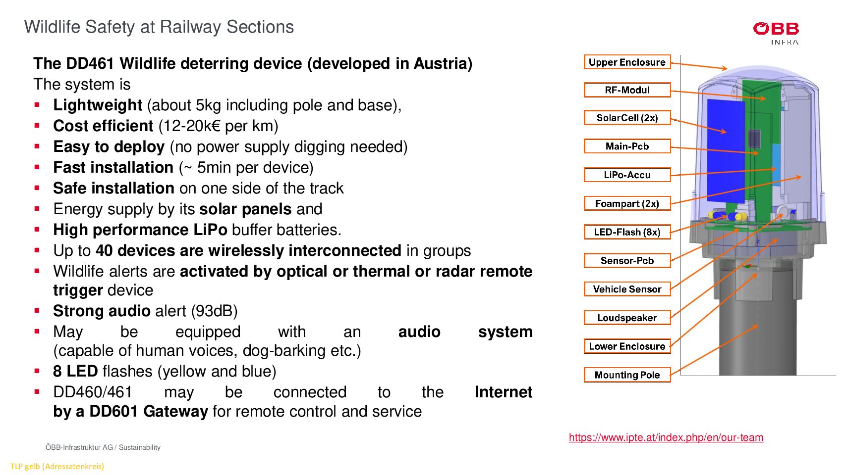 An innovation currently being tested is a trackside wildlife deterrent system. Â Attached to a pole, the device emits a âstrong audio alertâ to deter animals from the track when trains pass. It is a mobile unit powered by solar panels so there is no need for expensive cabling. âNote, the âalertâ is designed to be effective but not so loud it disturbs people living nearby,â points out Mr Schuh. âAustrians are extremely sensitive to noise pollution!â