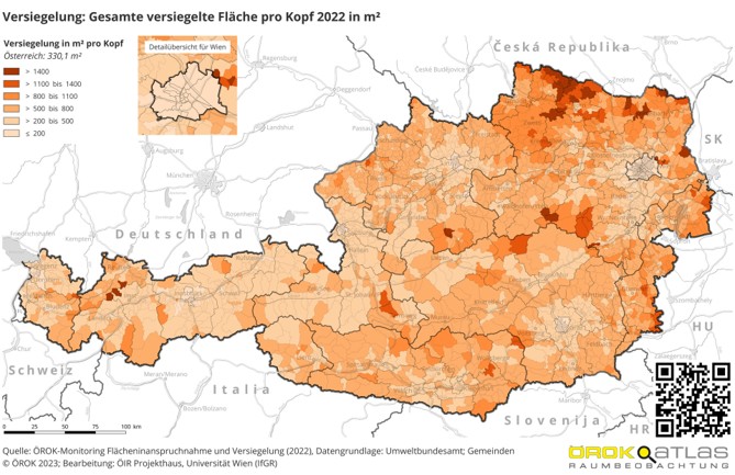 Austria is being built up and sealed (rendered permeable to water and air) too much and too fast. In 2022 alone, it lost more than 5,000 hectares of fields, meadows, pastures, and vineyards. Interestingly, this land take is partly decoupled from population growth.