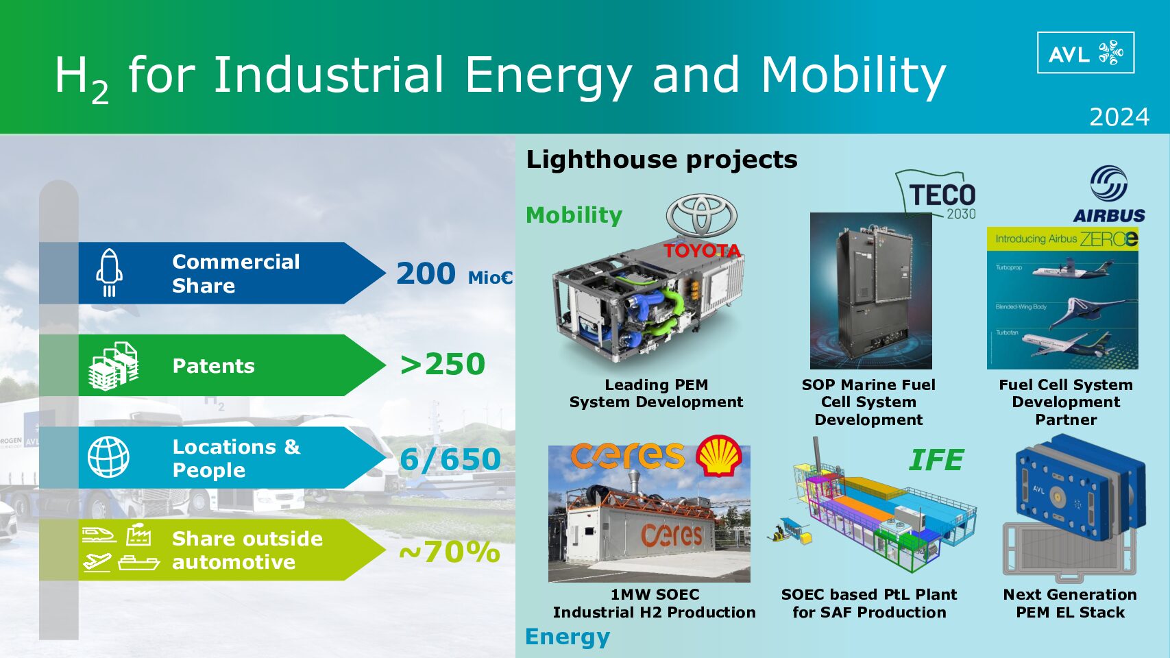 AVLâs decarbonisation strategy is focused on three main vectors: electricity, hydrogen, and e-fuels. Its energy division, which includes testing and simulation activities, accounts for around 10% of its revenue. It has a team of 650 engineers across six sites, 70% of whom work outside the automotive sector but within the mobility sector.