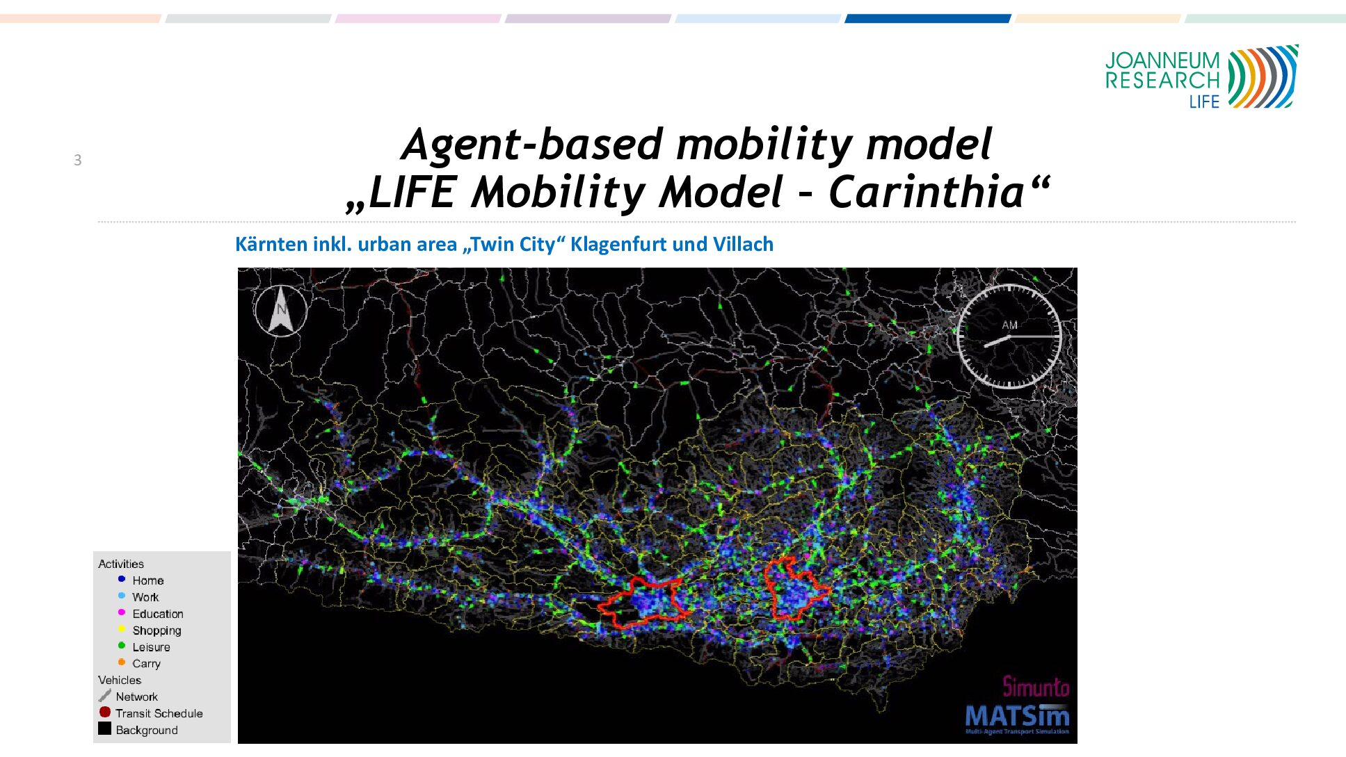 In order to explain human behaviour, based on original work by ETH Zurich, LIFE has developed a digital twin model of the city of Klagenfurt in Carinthia (Austriaâs southernmost province), but also the entire province of Carinthia. It shows all the 670,000 inhabitants as individual mobility agents. âSo it is really a live mobility but also activity model,â details Mr Prettenthaler. âWe use a lot of statistical modelling and measuring to see how many people are driving at certain points. For every household, we know where they work, where they go to school, where they have children in kindergarten â but of course as a statistical model it complies with data protection laws.â