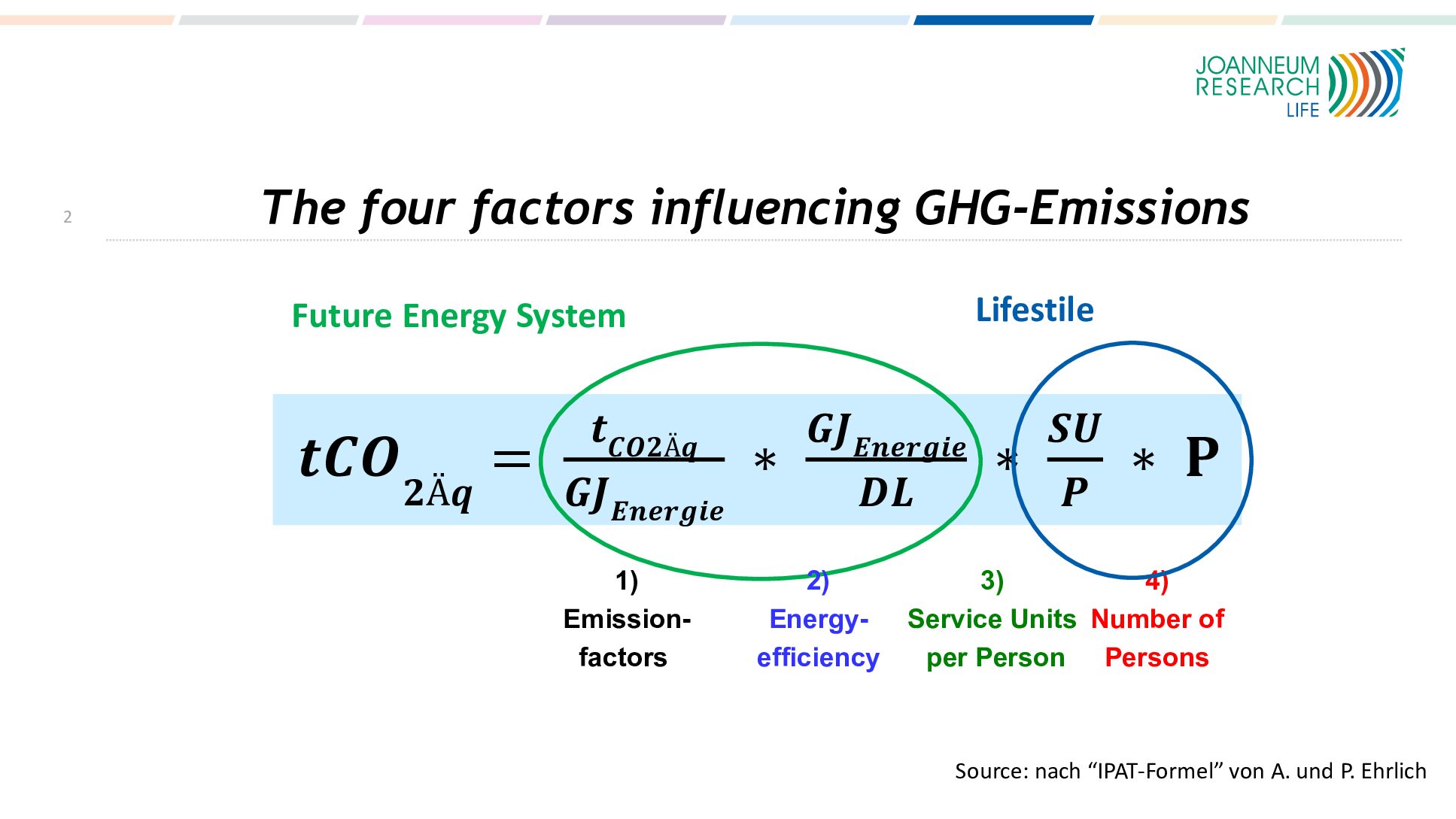 With regards climate change, there are four factors influencing GHG emissions: âemissions per energy unitâ x âenergy unit per service unitâ x âservice units per personâ x âthe number of peopleâ.â These four factors explain the impact of the entire human society on the climate. âWhat is fundamental at LIFE is that we are interested in understanding both the technical (emissions factors and energy efficiency) and the human parts of the equation, i.e., how many service units per person are being consumed,â explains Mr Prettenthaler. âMultiply this by the number of people and you will obtain a true climate efficiency score.â