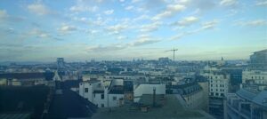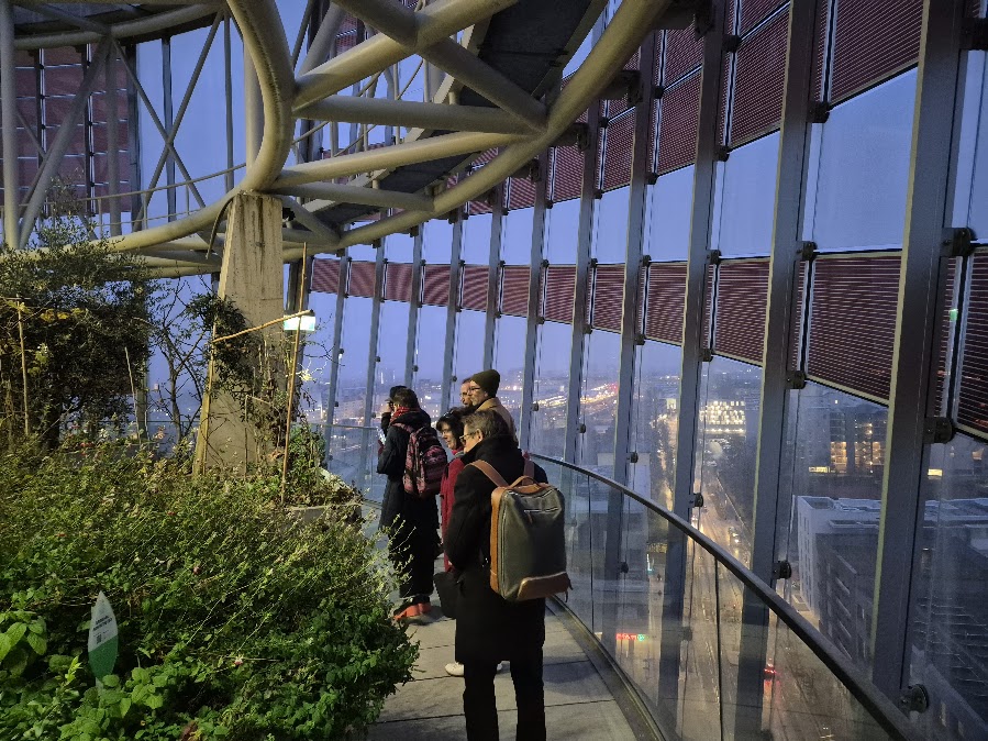 Futura-Mobility ended its learning expedition on a veritable high! Mr Prettenthaler kindly took the delegation on a guided tour of the rooftop farming garden, with its abundant fruit, vegetables and flowers, encircling the Science Tower. Designed by the LIFE Institute to combine four functions, produce food, cool the temperature of the city, provide electricity, and counteract surface sealing at ground level, in 2020 the installation received the Energy Globe Styria Award, research category.