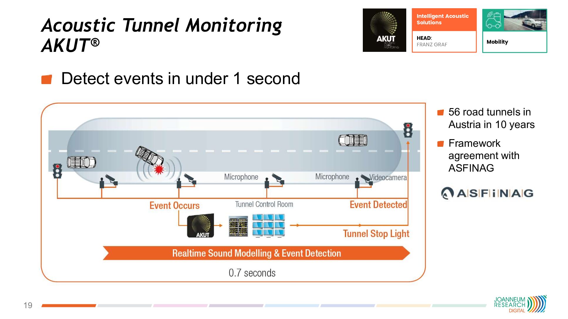 One flagship project is AKUTÂź for acoustic tunnel monitoring, which combines intelligent microphones and artificial intelligence (AI) based on installing arrays of on arrays of intelligent microphones. “Acoustic systems can detect events that may lead to a fire significantly earlier than video cameras or conventional fire detectors,â says Harald Mayer, deputy director, Institute for Digital Technologies. âIncidents can be signalled in under a second!â Following a framework contract with Austriaâs motor- and expressway operator ASFiNAG (see How is the transport sector protecting biodiversity in Austria?), the system is being installed in all high-level road tunnels across Austria, 56 in total.