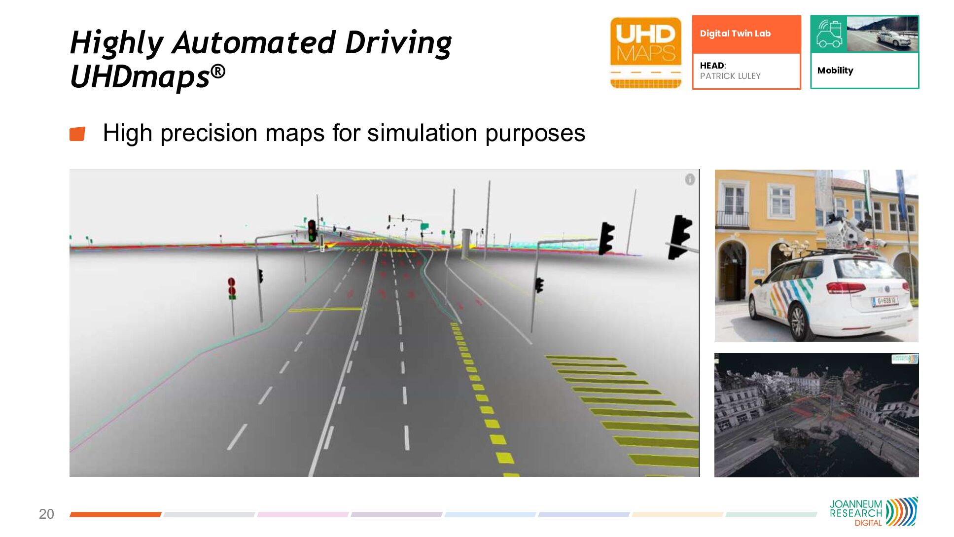 âMobility and infrastructure are core applications at our Digital Twin Lab,â points out Mr Mayer. Indeed, this Lab has carried out research using digital twins to support automated driving. âYou need simulations as a basis for automated driving,â explains Mr Mayer. âOtherwise, you would have to drive millions of kms to prove your automation functions. We worked on producing  the ultra-high definitions maps needed, as part of DigibusÂź, the Austrian flagship project (2018â2021) for automated driving in public transport.â